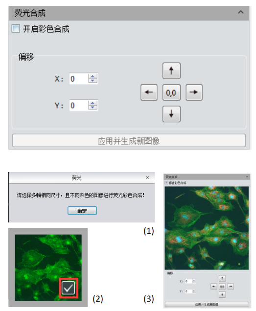 在生物科學領域,常常用不同的熒光染料標定不同的細胞結構,在熒光顯微鏡下只能看到一種熒光圖像。熒光合成功能可幫助用戶將同一視野下的多張熒光圖像合成為一張,從而獲得一張完整的彩色圖像。